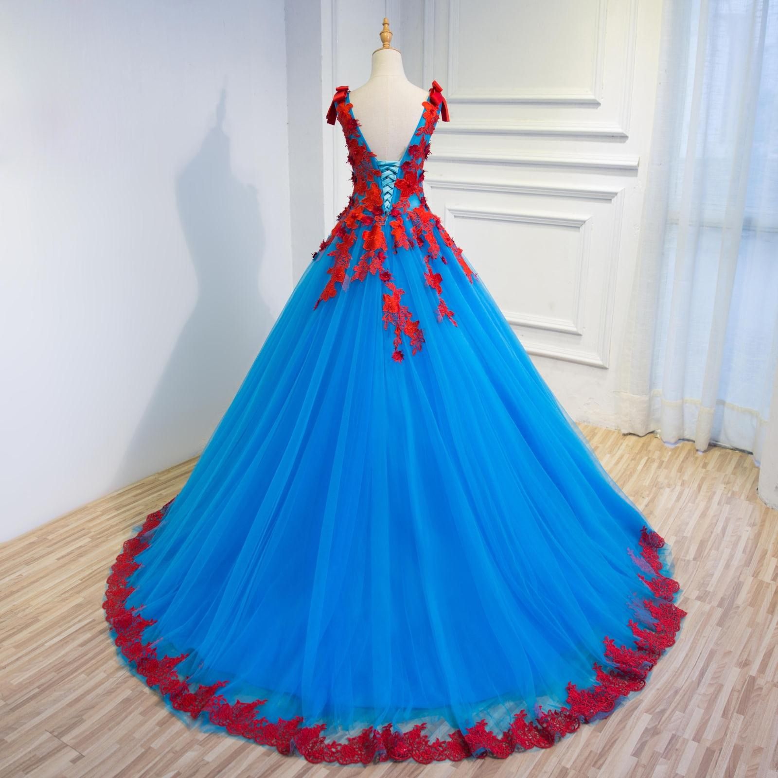 Real V Neck Blue Colorful Wedding Dresses Deep V Neck Beaded Lace