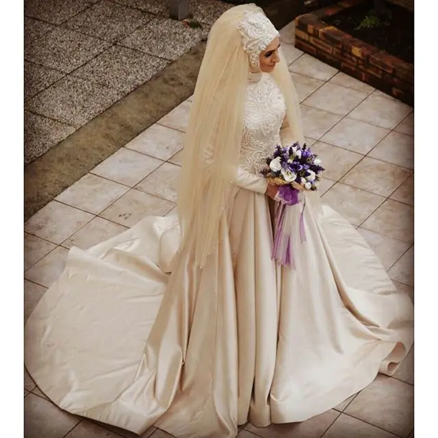 Long Sleeve Champagne Colored Ball Gown Muslim Wedding Dress With