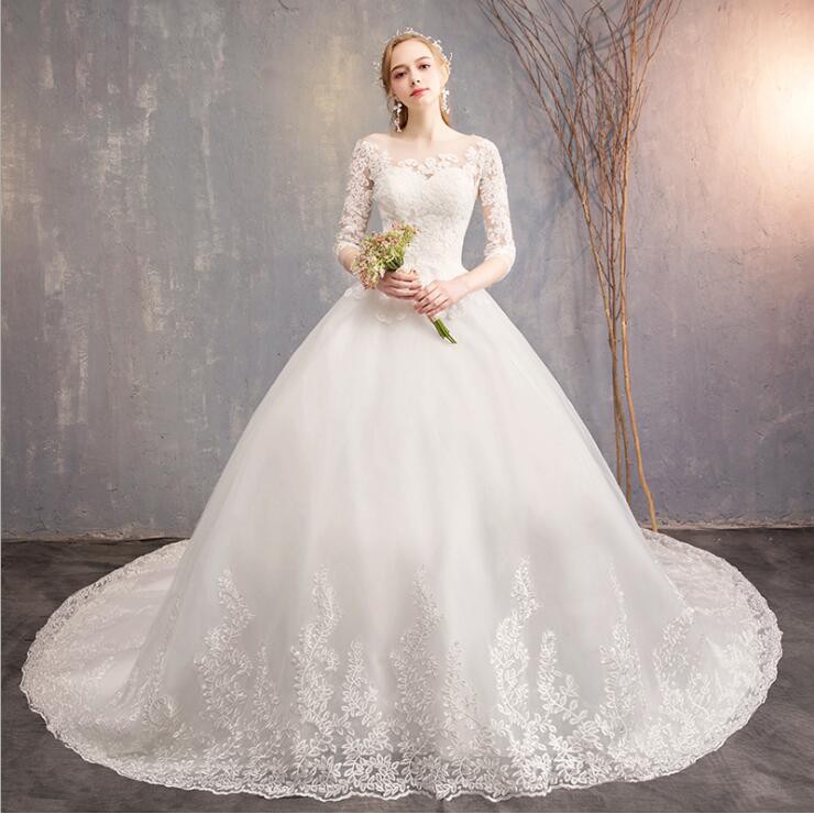 White Romantic 3 4 Sleeve Big Long Tail Lace Embroidery Wedding