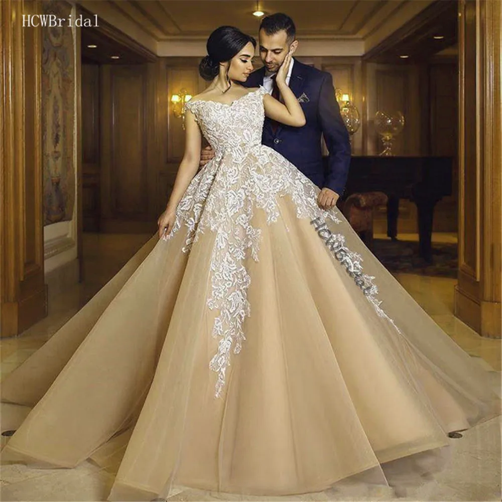 Luxury Ball Gown Arabic Wedding Dresses Champagne Off The Shoulder