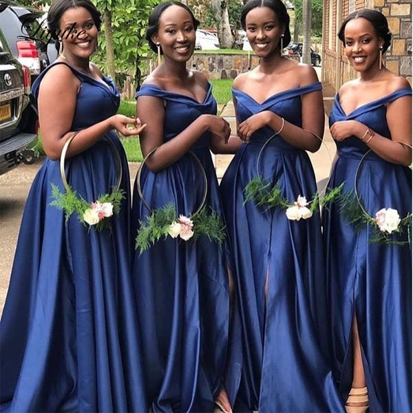 Off The Shoulder Navy Blue Bridesmaid Dresses 2019 V Neck Side